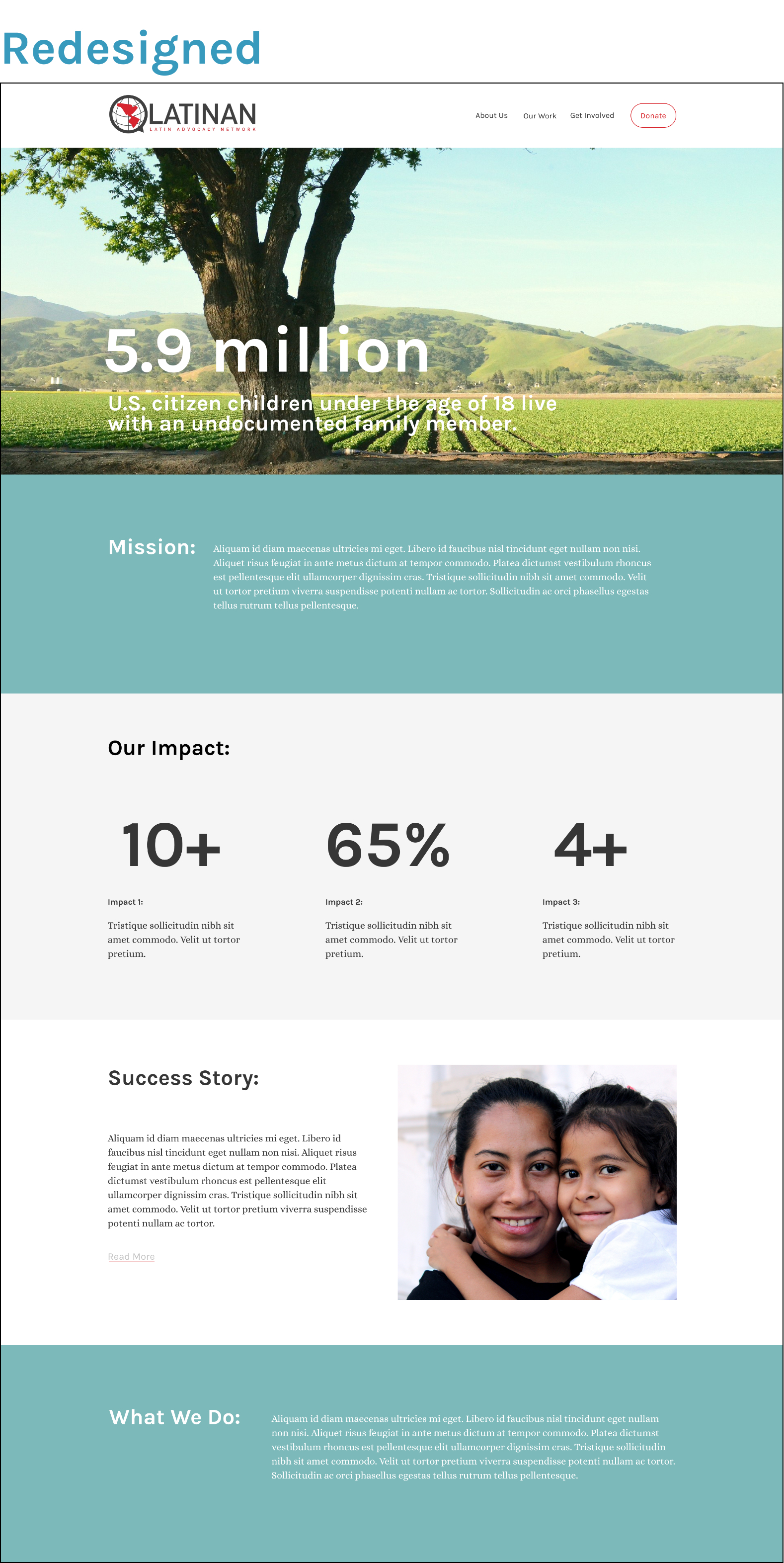 The competitive and comparative analysis helped identify specific areas where the Latinan website could improve. Potential grant foundations and volunteers stressed the importance of a website that is rich in photos, infographics and success stories to draw them into the nonprofit’s mission.