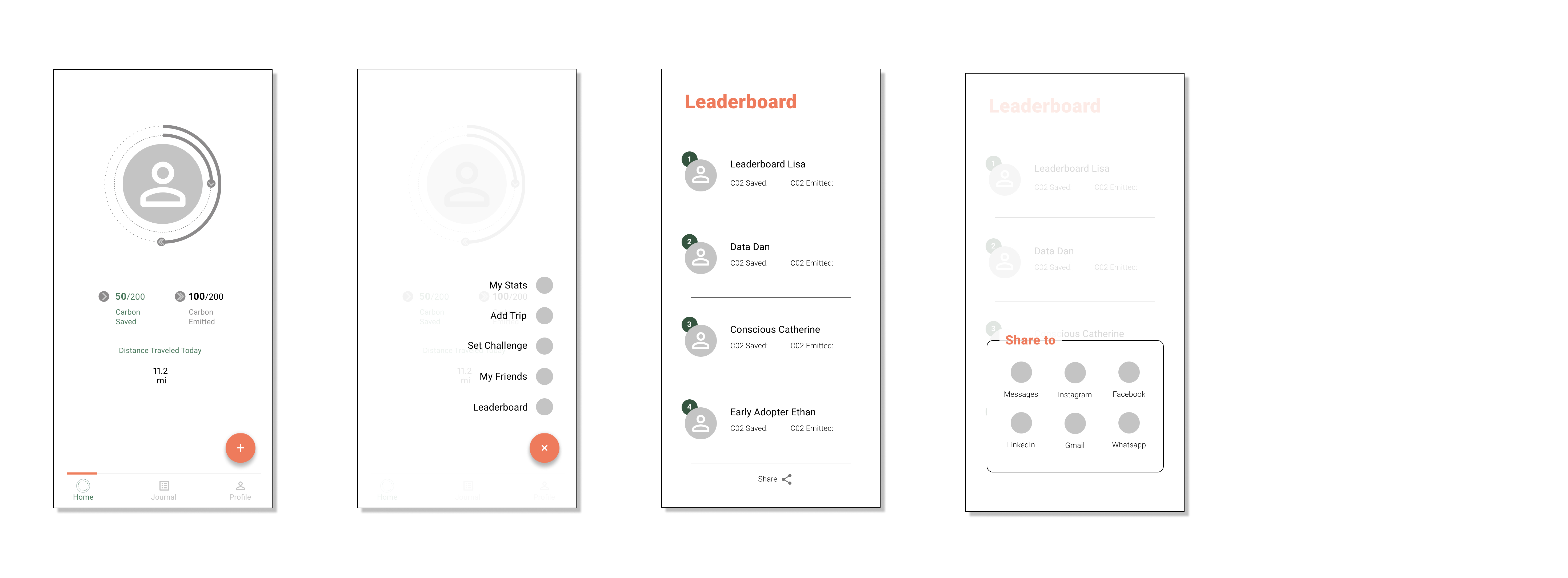 For my next step I wanted to quickly iterate some paper prototypes to learn if my design was user friendly and gain insights on how it could be improved. The three tasks I asked users to complete included creating an account, sharing their leaderboard status and viewing their weekly emissions total. All 5 of the users I tested were able to complete all of the tasks without any help or prompts.